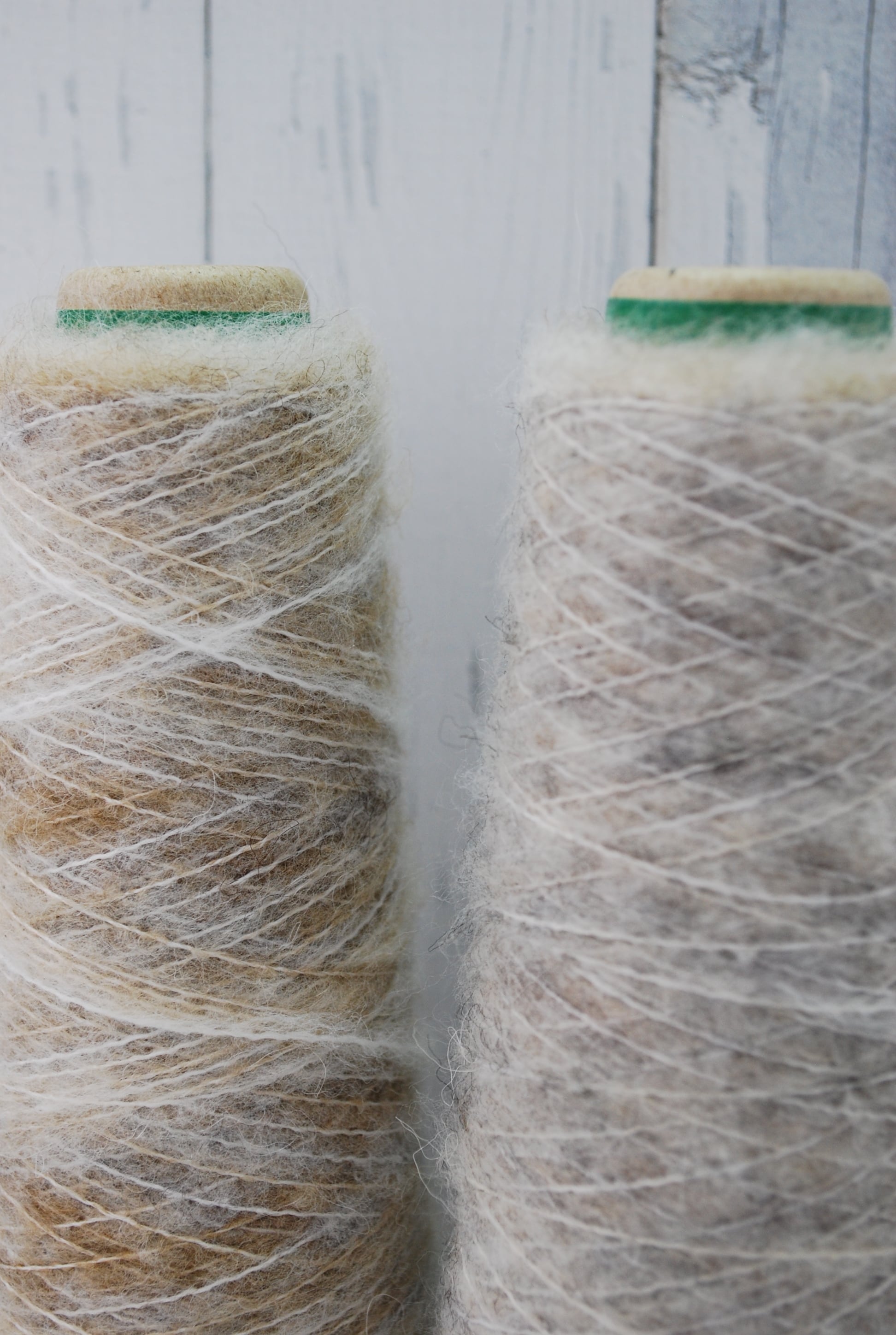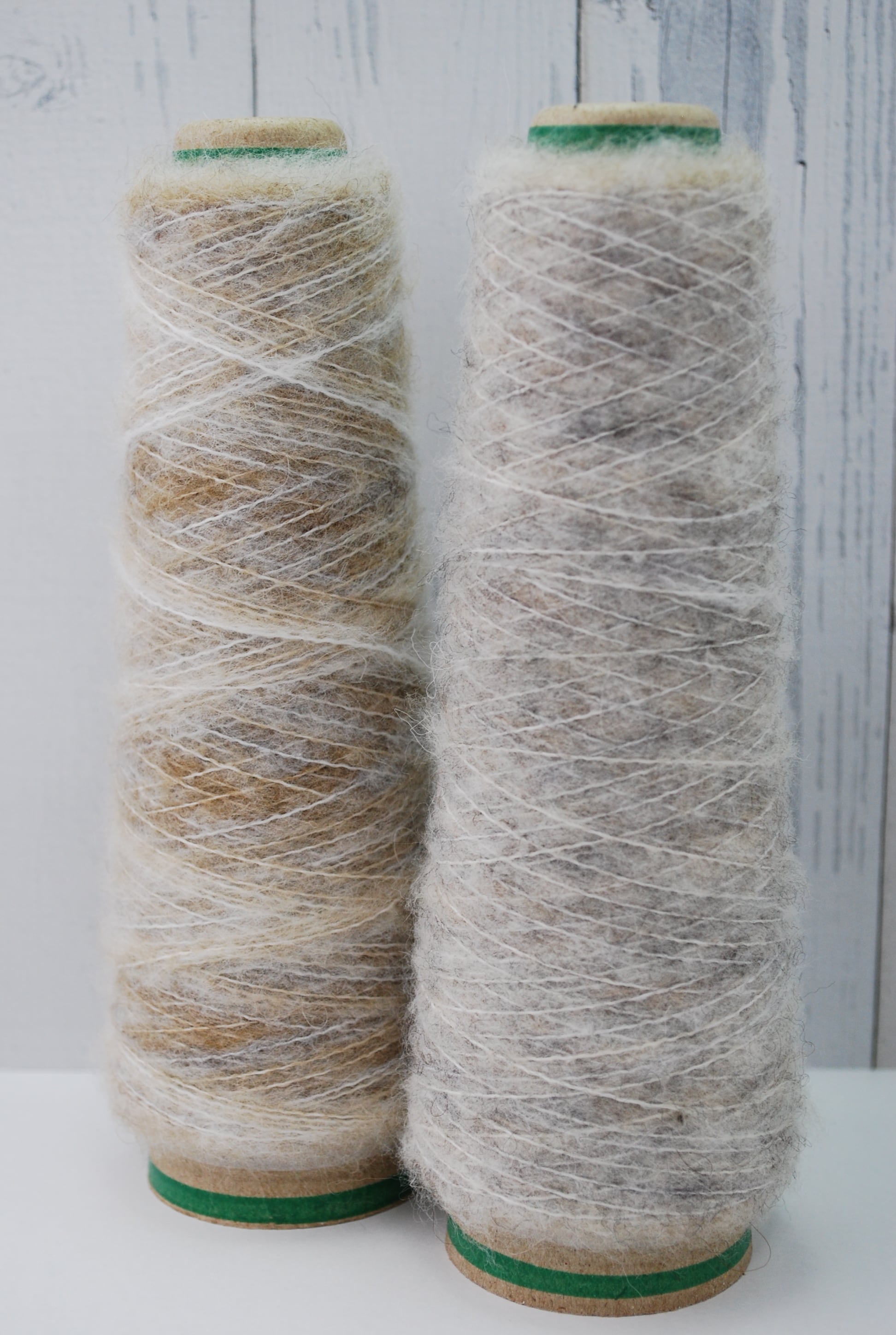 ブラッシュアルパカMIXは、糸起毛を施したロングピッチのMIXヤーンです。1本の糸の中で白、グレー、ベージュの3色の美しいグラデーションを楽しむことができ、非常にヘアリーでふんわりとした、やさしい素材感が特長です。手編みや編み物の新しい表現をぜひ体感してください!