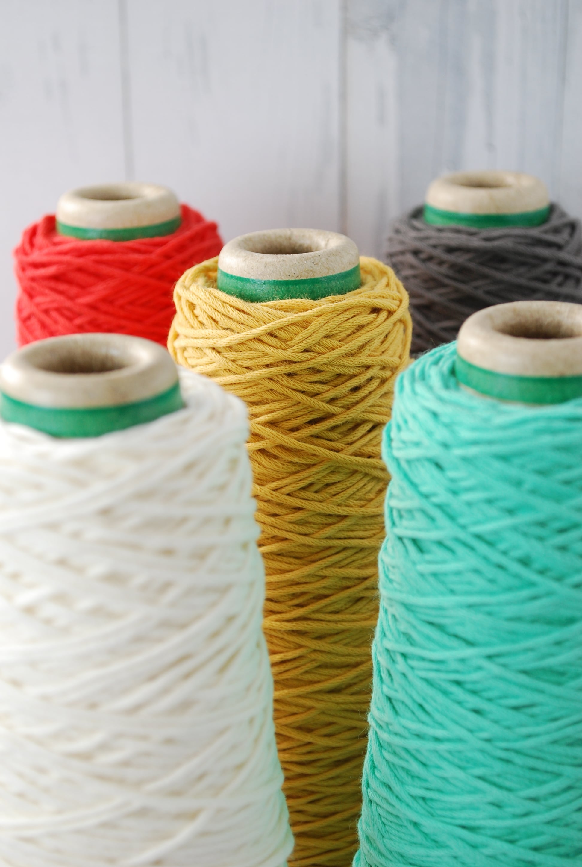 LABOYORI オリジナル ヤーンカバーリリヤーンは、通常の綿糸を細い綿糸のリリヤーンで包み込み、独自のファンシーヤーンを生み出しています。柔らかな質感とコシ感を兼ね備えたこの糸は、リリヤーンで包まれているので編んだ後の目面がきれいな感じに仕上がります。