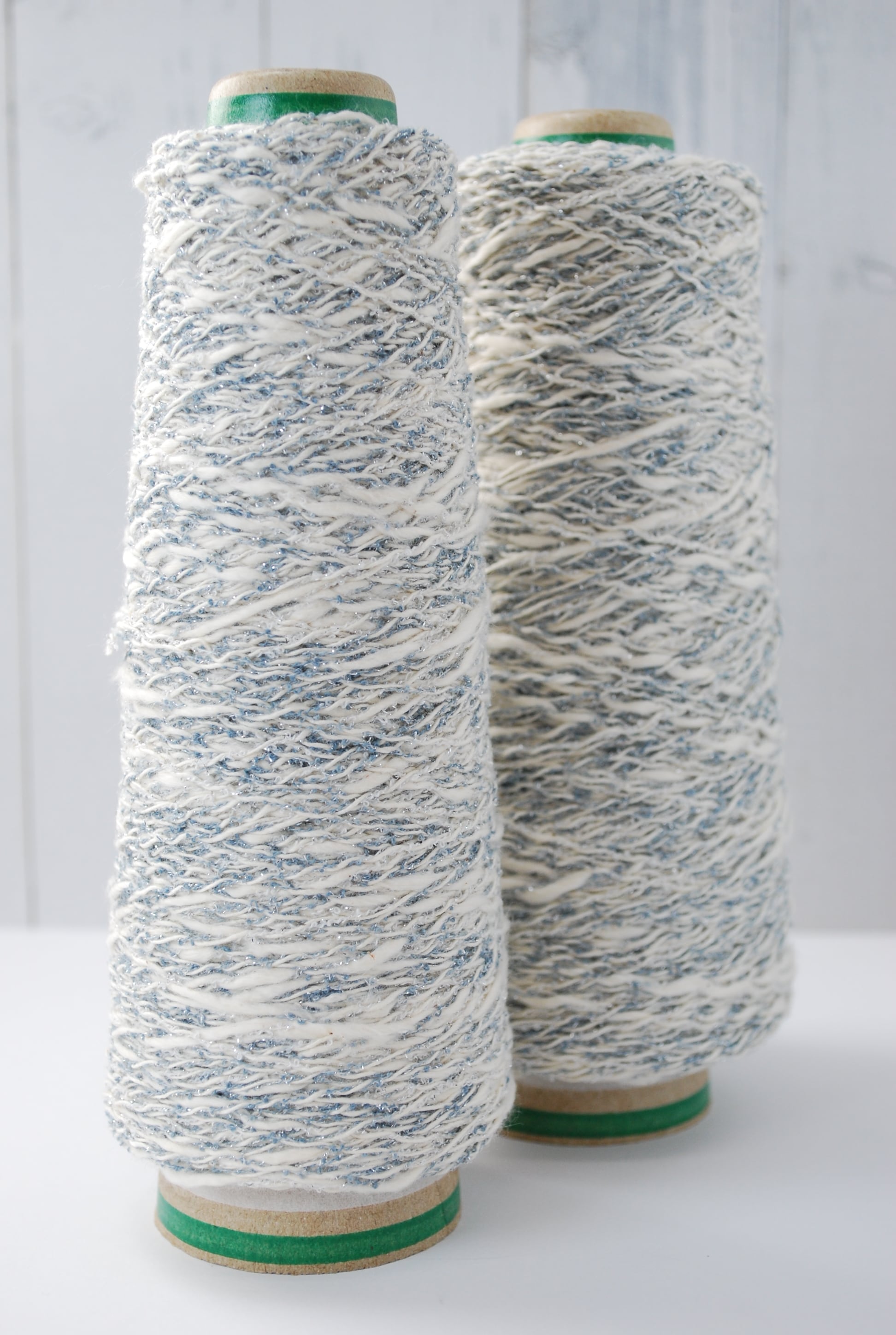 スラブラメミックスは、柔らかなスラブ糸にミニループラメ糸を撚糸して作られたファンシーヤーンで、繊細な色合いときらめきが特徴な糸になります。