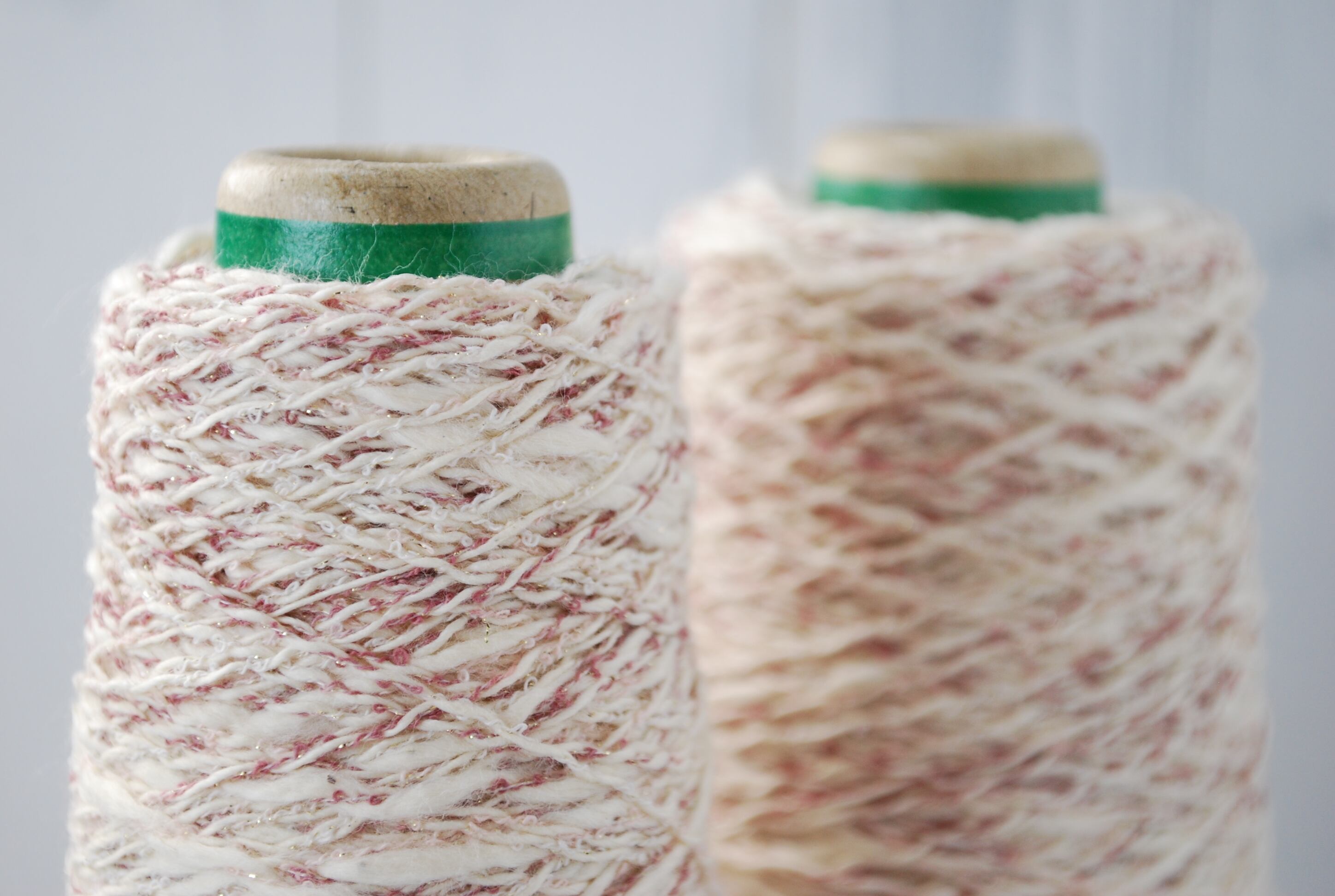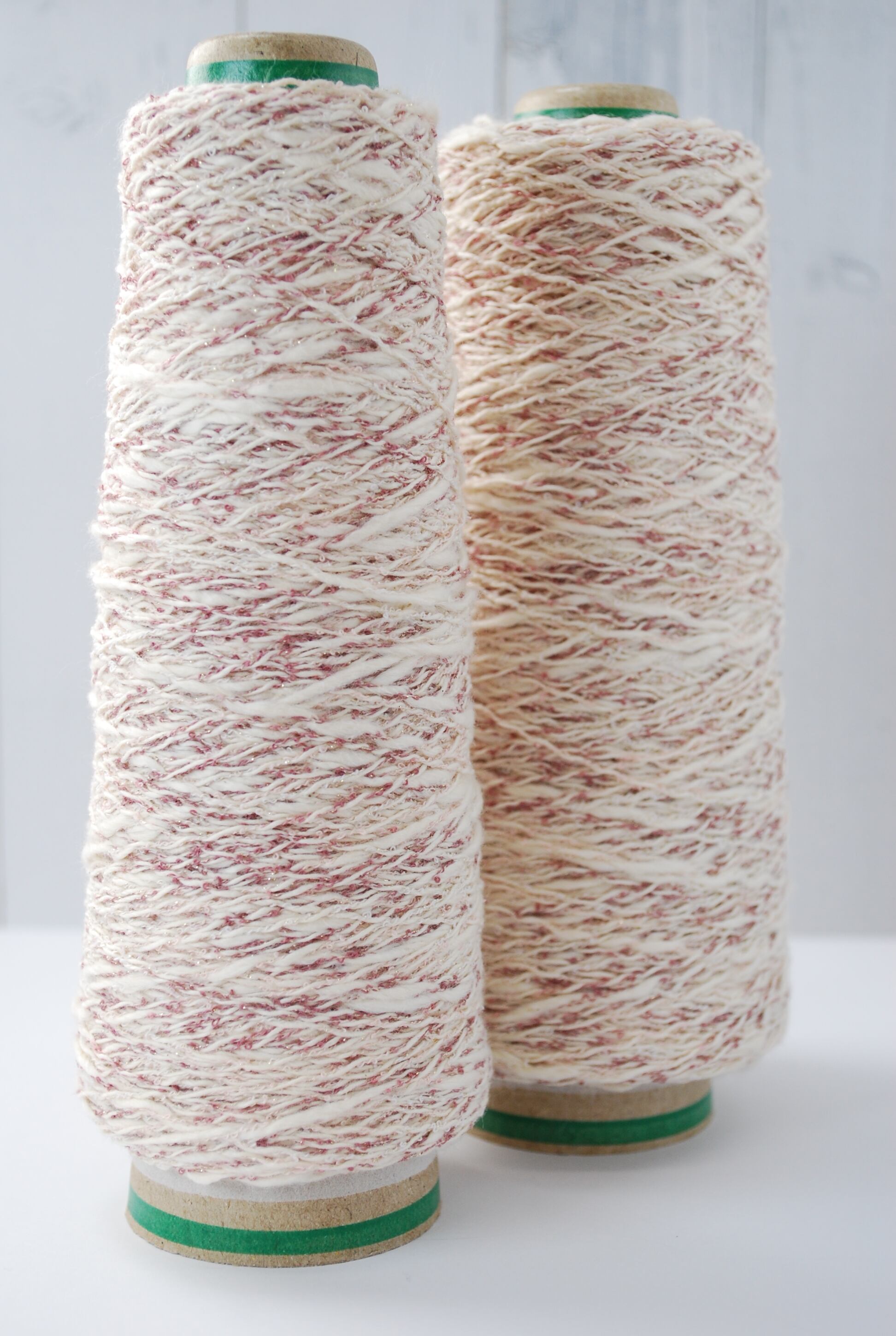 スラブラメミックスは、柔らかなスラブ糸にミニループラメ糸を撚糸して作られたファンシーヤーンで、繊細な色合いときらめきが特徴な糸になります。