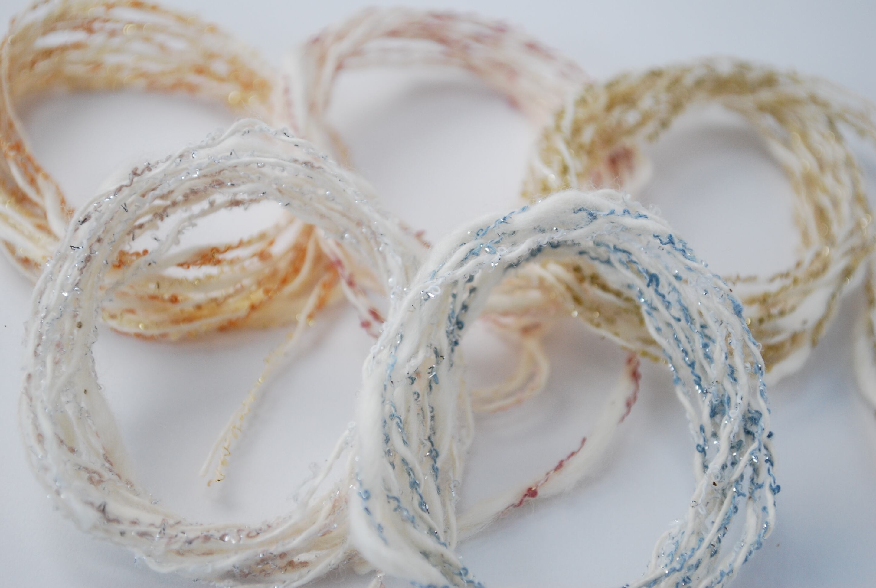 スラブラメミックスは、柔らかなスラブ糸にミニループラメ糸を撚糸して作られたファンシーヤーンで、繊細な色合いときらめきが特徴な糸になります。